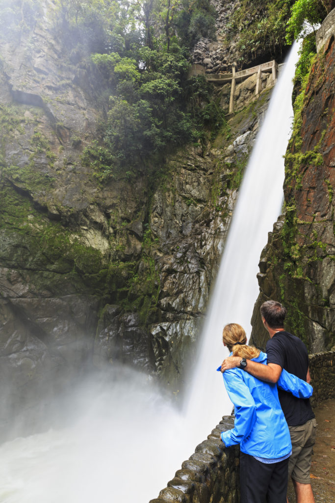 Ecuador, Tungurahua, Banos de Agua Santa, tourists at waterfall Pailon del Diablo