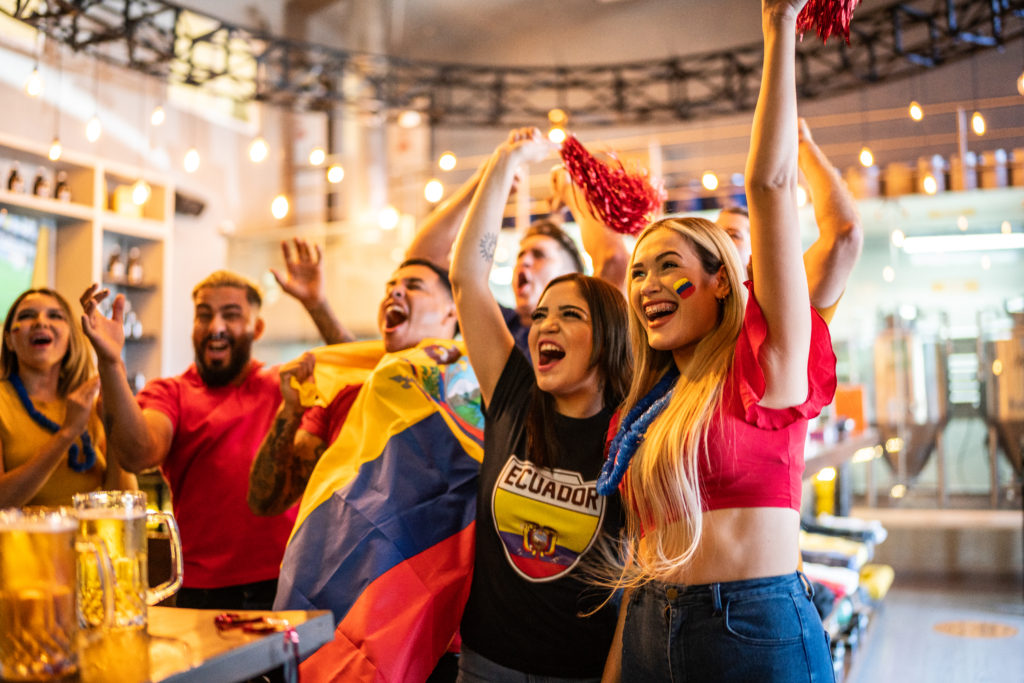 Ecuadorian fans watching a soccer game and celebrating at bar