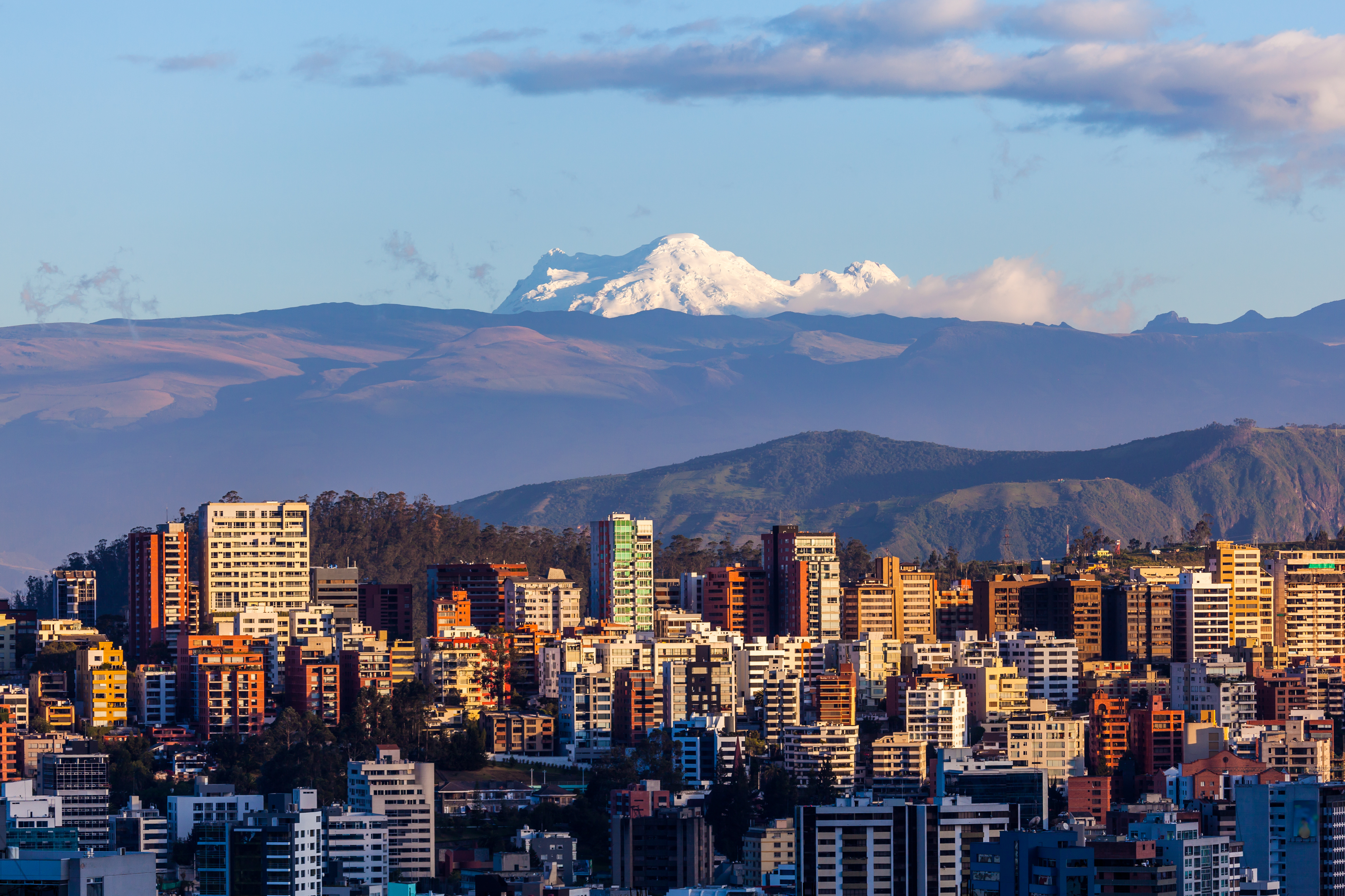Edificios Quito iluminados por el sol al atardecer con volcán Antisana en el fondo