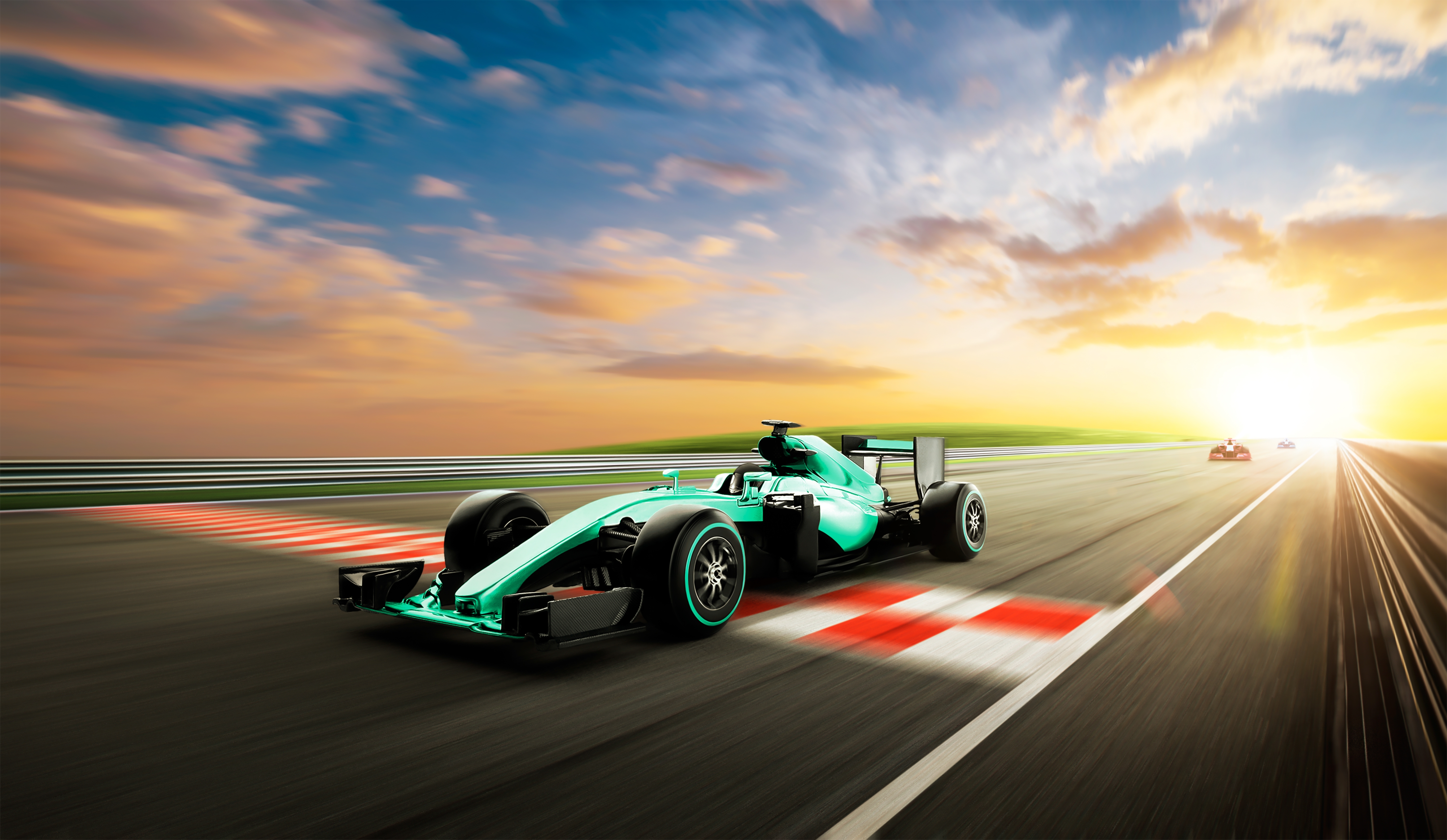 El conductor pasa el punto de acabado y la carrera de autos de carrera en una pista con desenfoque de movimiento. Representación 3D.