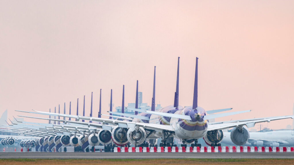 El estacionamiento de aviones en la pista del aeropuerto debido a la epidemia de la enfermedad COVID-19 hace que las aerolíneas paren sus operaciones.