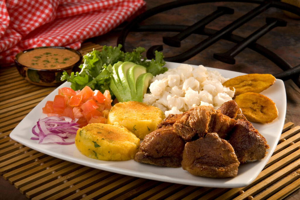 El plato ecuatoriano tradicional y famoso llamado “Fritada”. Es un plato de cerdo estofado que siempre se sirve con pasteles fritos de patata, granos de maíz cocinados con huevo, aguacate, plátano, tomate y cebolla.