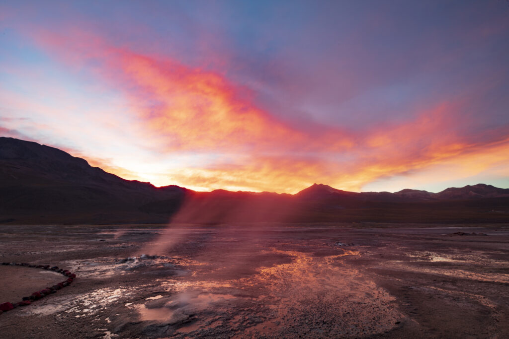 El Tatio geysers at sunrise – third largest geyser field in the world and one of the highest located, at 4,320m, Atacama Desert, Chile, January 20, 2018