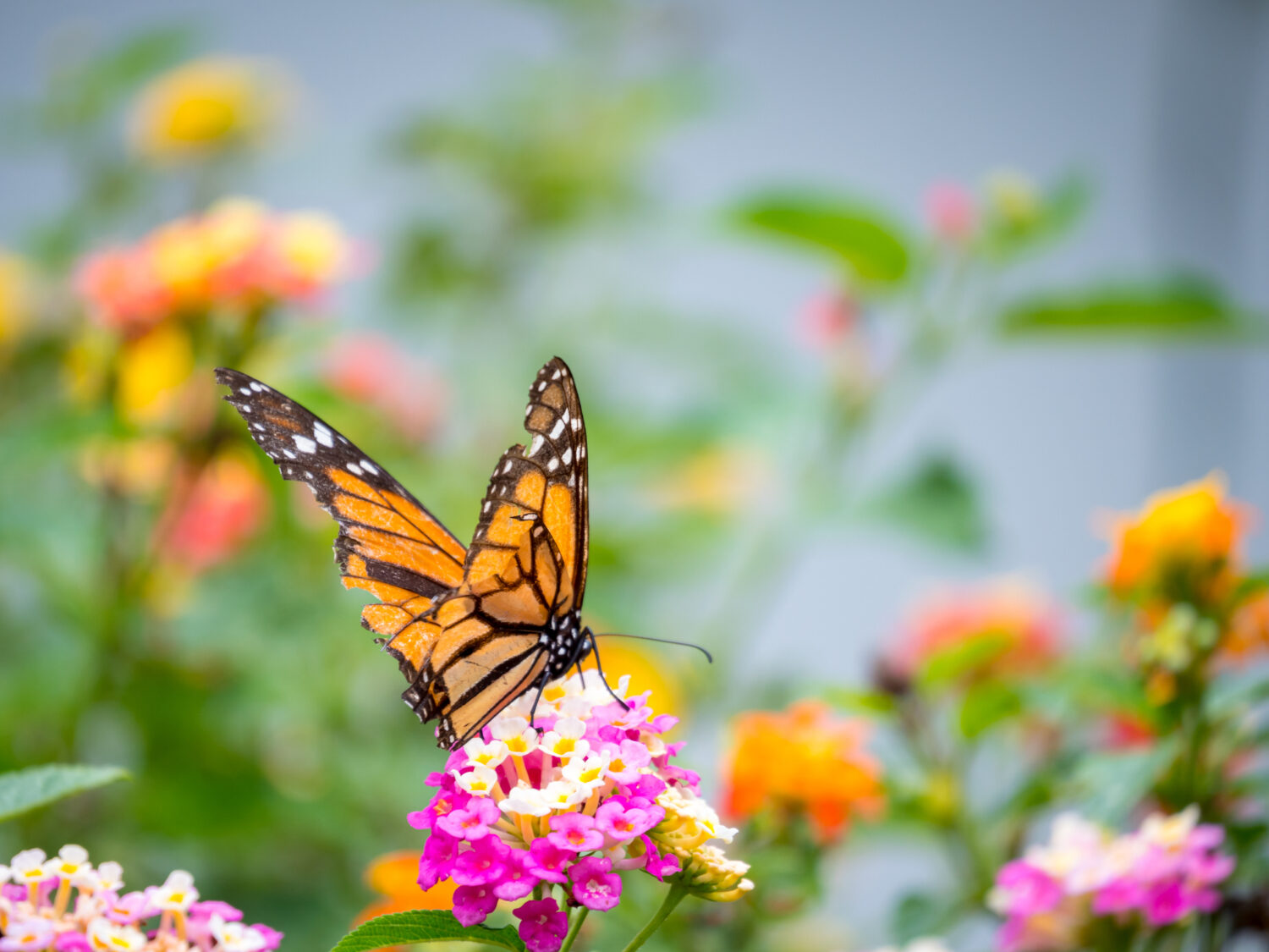 El Viceroy es una mariposa Naranja y Negra que se encuentra sobre las flores amarillas y rosas (Lantana Camara) en Medellín, Colombia