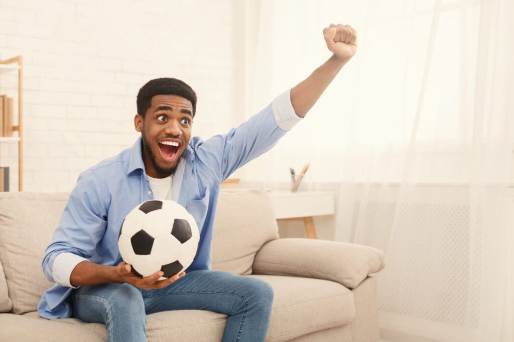 Emotional african american soccer fan watching sports on tv and supporting team at home, copy space