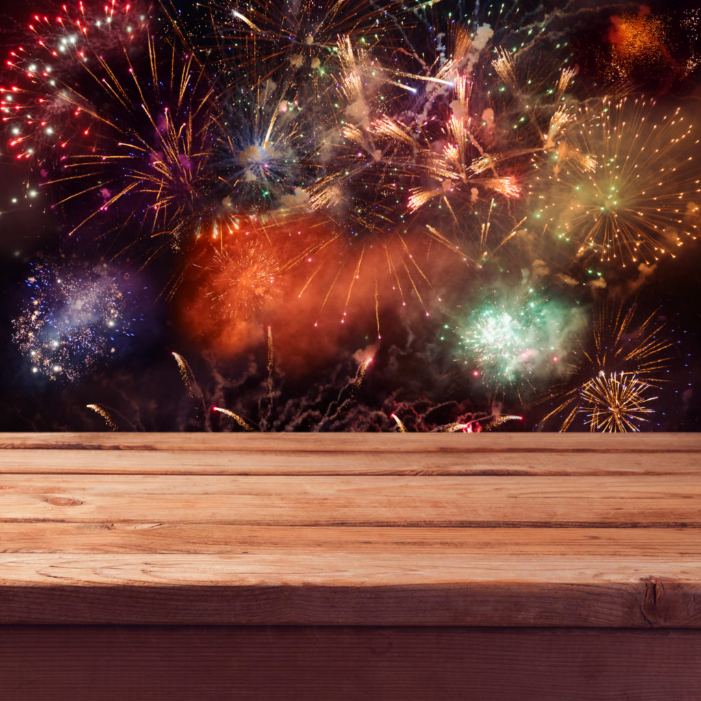 Empty wooden deck table over fireworks background. New Year eve celebration