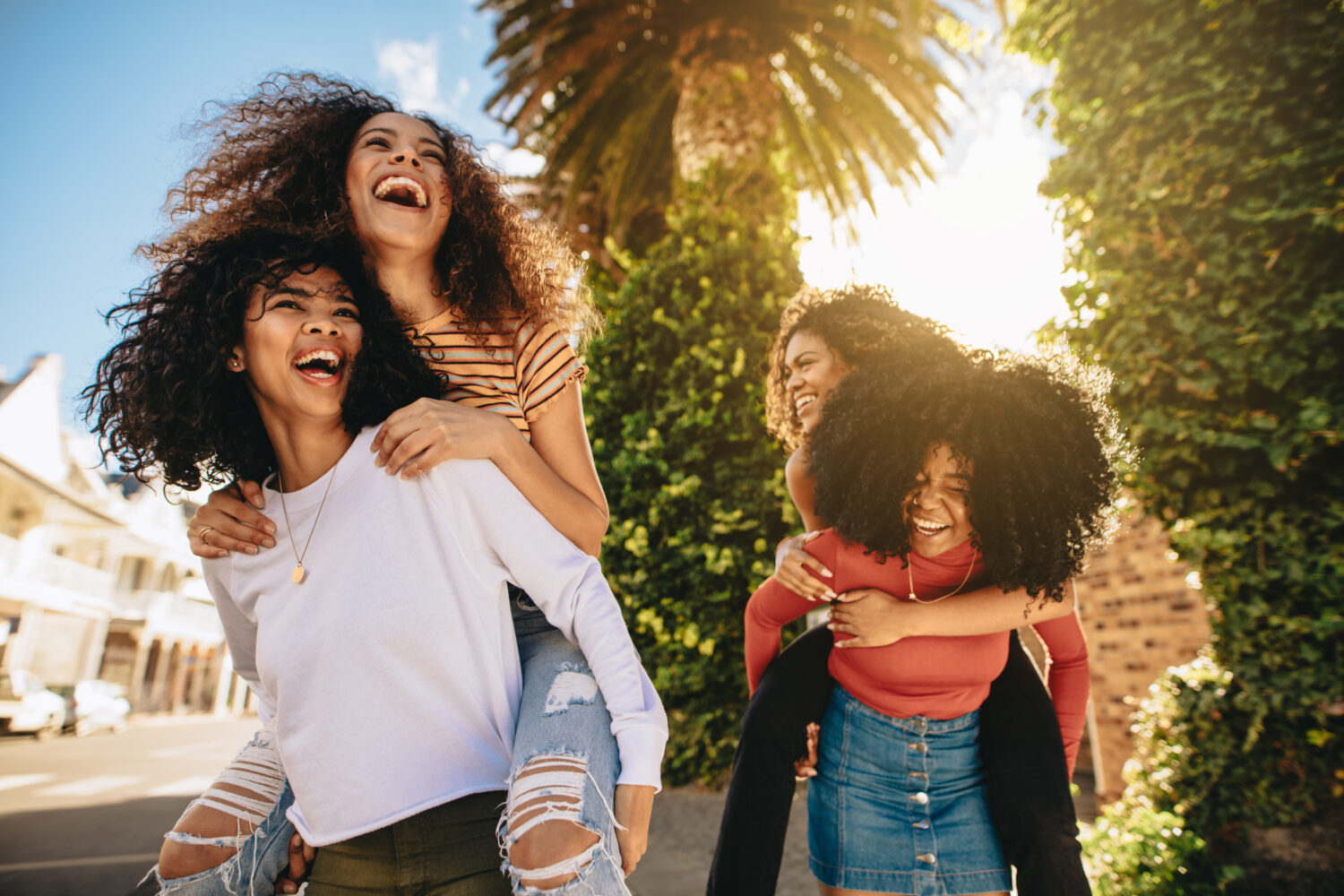 Entusiasmadas jóvenes que se disfrutan al aire libre. Grupo de amigas piggyback y pasarlo bien en la ciudad.