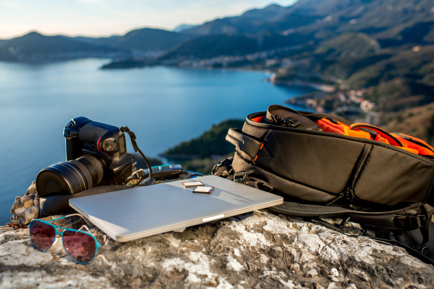 Equipo de fotógrafo de viajes en la montaña rocosa con bello paisaje en el fondo