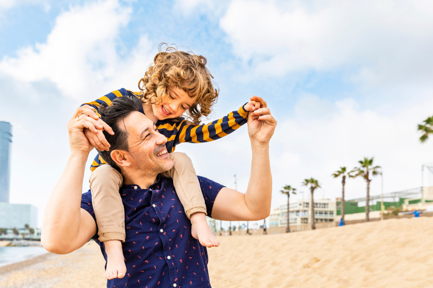 España- Barcelona- padre con hijo en la playa dando un paseo en piggyback