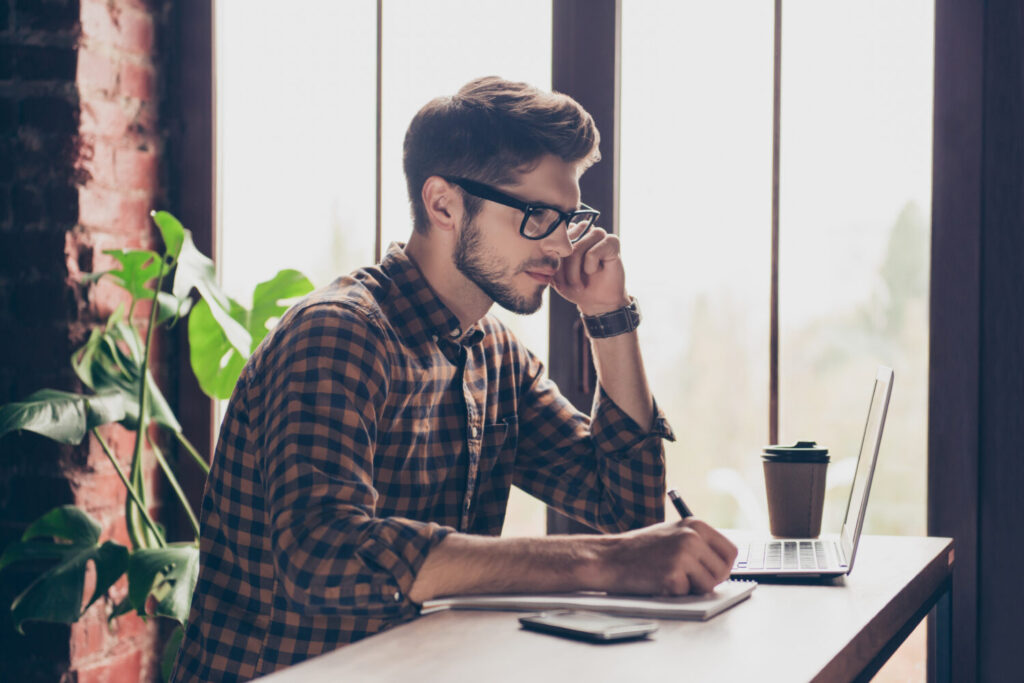 estudiante concentrado de mente con laptop preparandose para el seminario