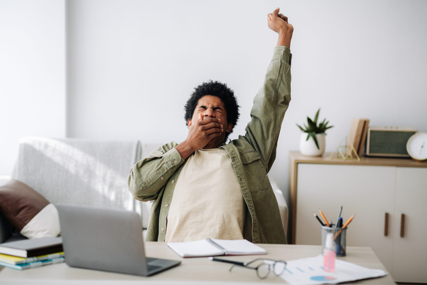 estudiante negro cansado bostezando y estirandose durante sus estudios remotos