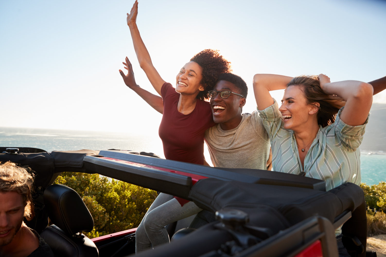 Excited millennial friends travelling in the back of an open car with their arms in the air