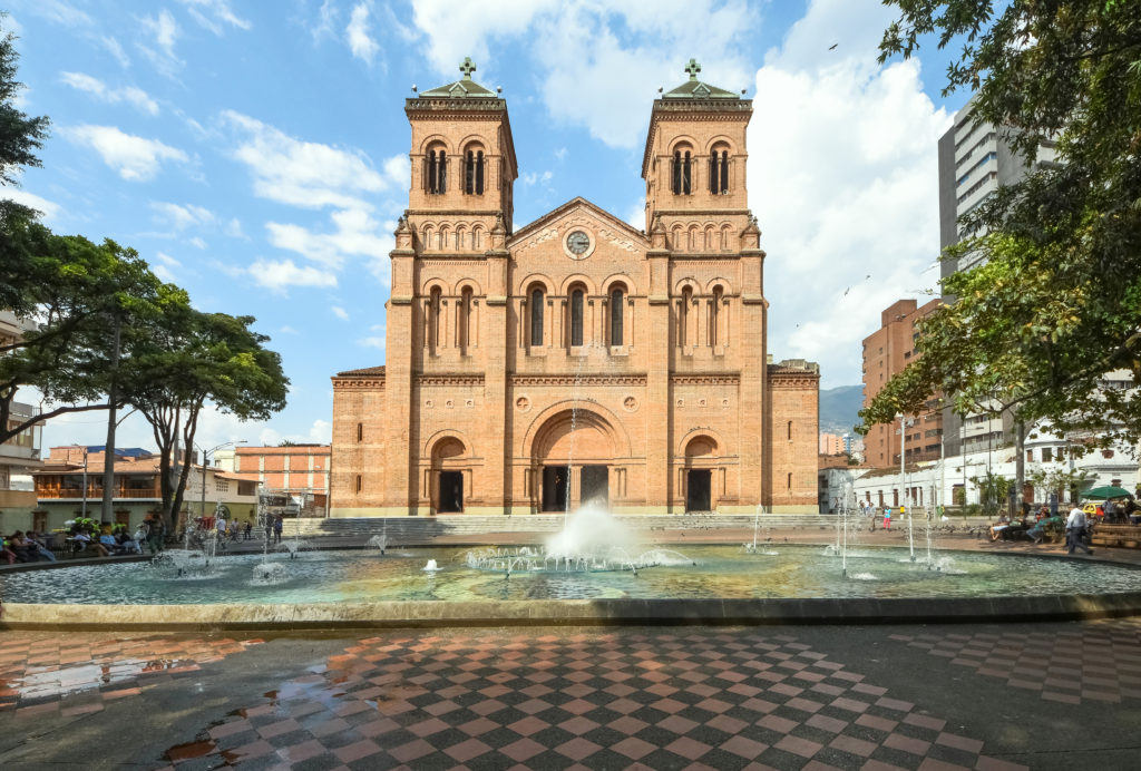 Majestic facade of the Metropolitan Cathedral and Basilica of the Immaculate Conception (“Metropolitan Cathedral of Medellín”) in neo-Romanesque style in Medellin, Antioquia, Colombia