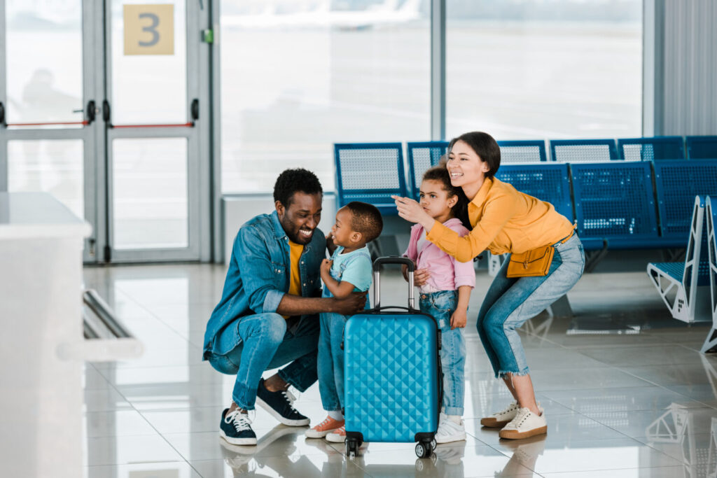 familia afroamericana sonriente con equipaje y niños en el aeropuerto