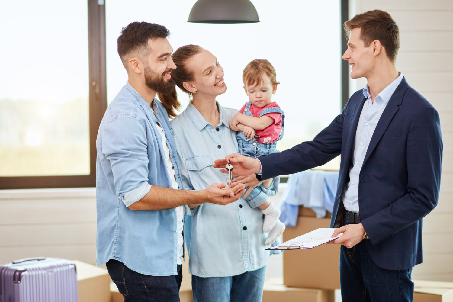 Familia caucásica de tres personas toman las llaves de la nueva gran casa de un agente inmobiliario. Sonríen. Cajas en movimiento de fondo, ventana grande.