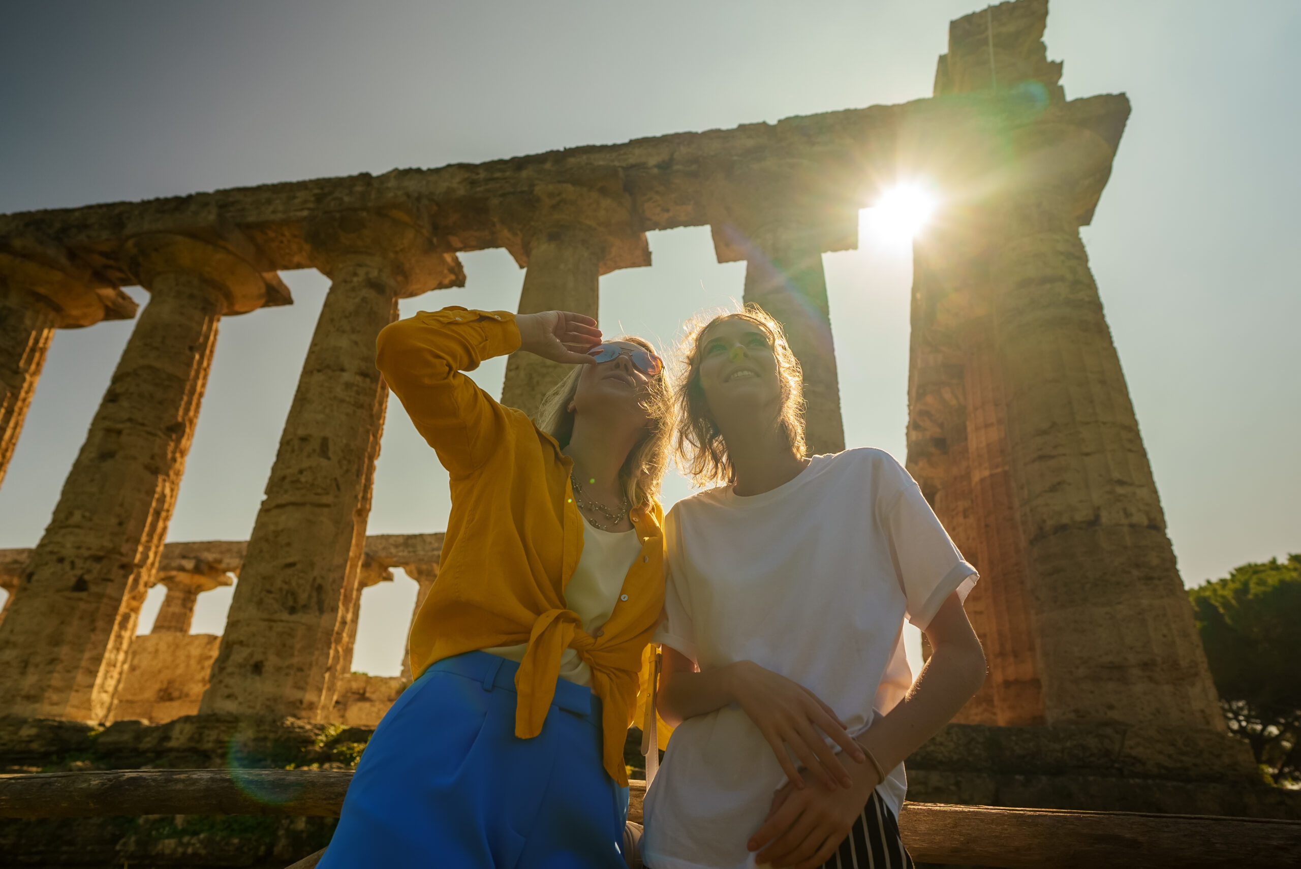 Family visits an ancient temple on a tour.