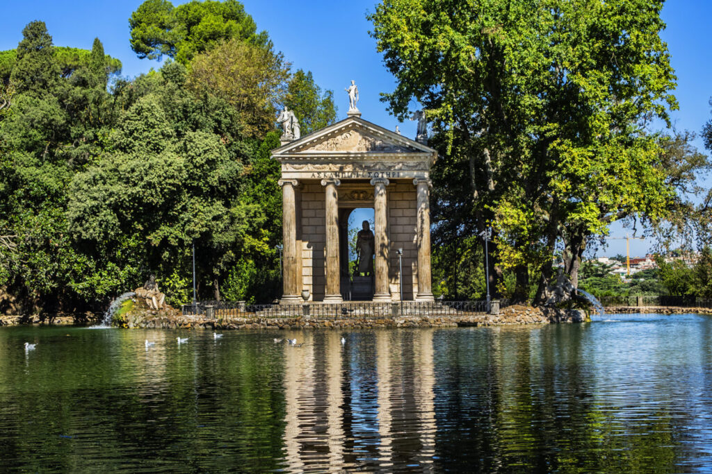 Famous Park ‘Villa Borghese’. Villa Borghese – XVIII century largest Public Park in Rome. Park features a lake, temples, fountains, statues and museums. Rome, Italy.