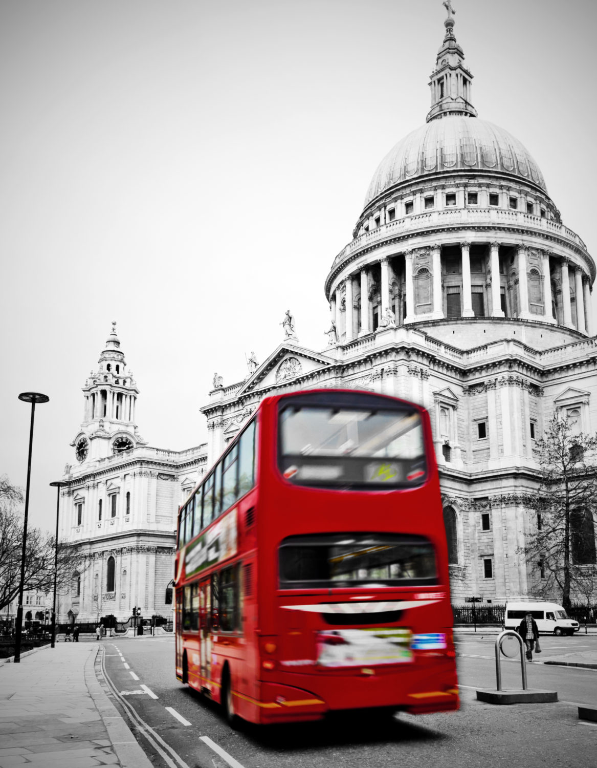 famous st pauls cathedral with iconic red bus in london ID: 35720 Famous St. Paul’s Cathedral with iconic red bus in London speeding past