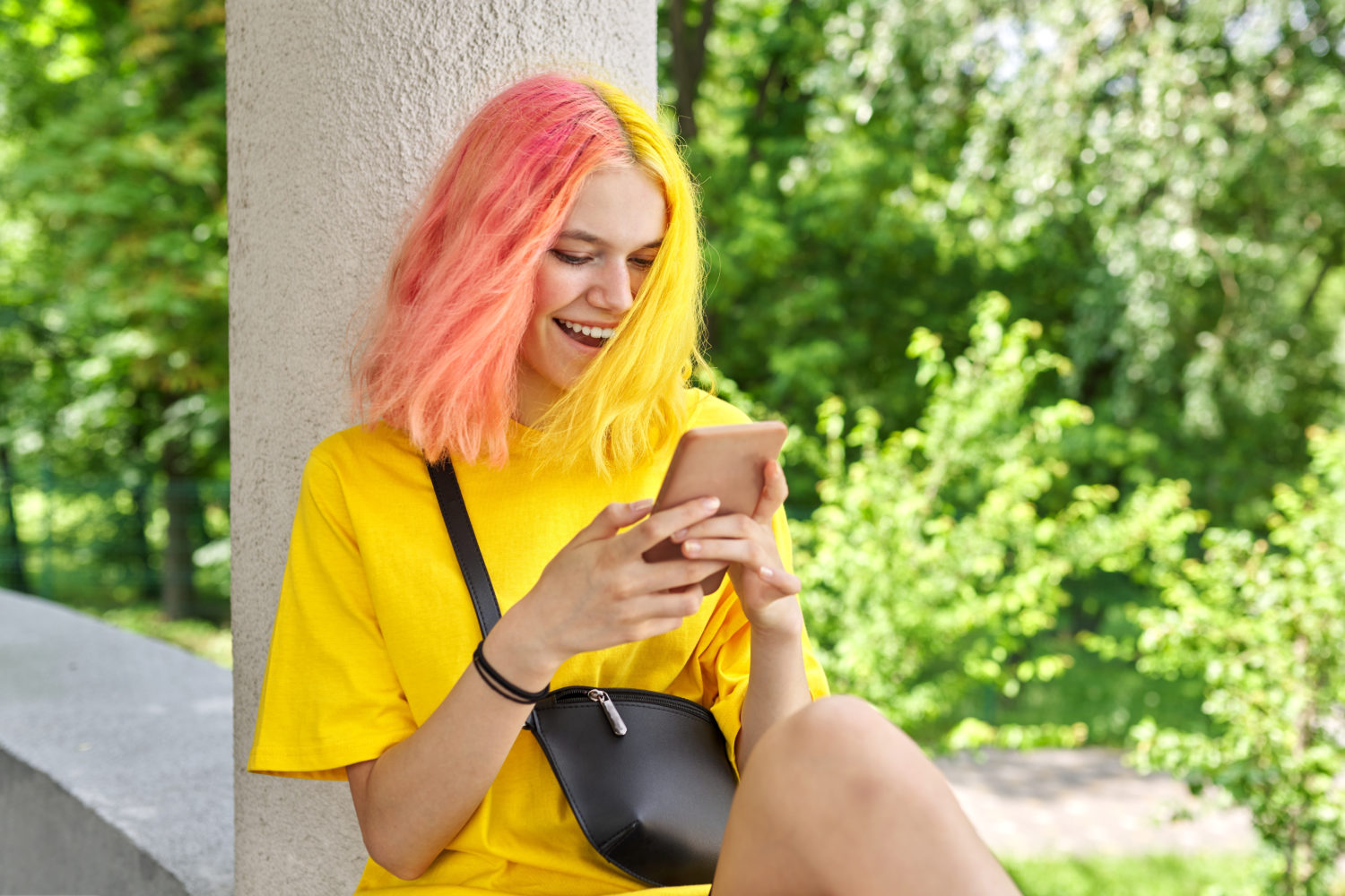 Fashionable teenager girl with colored dyed hair with a smartphone outdoors. Smiling bright young woman in yellow t-shirt with yellow pink hair