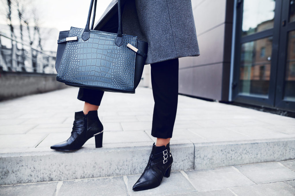 Fashionable woman posing in street, holding big dark blue textured bag, wearing stylish pointed toe ankle boots, elegant clothes. Female fashion concept. Copy, empty space for text.