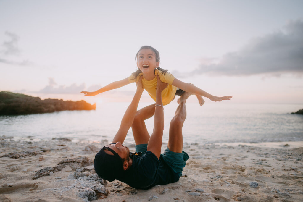 Father and young daughter playing airplane on beach at sunset ID: 78328 Father and his young daughter playing airplane on beach at sunset, Japan