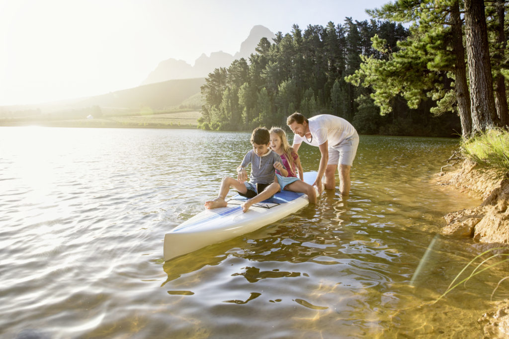 Father assists children with paddle board.