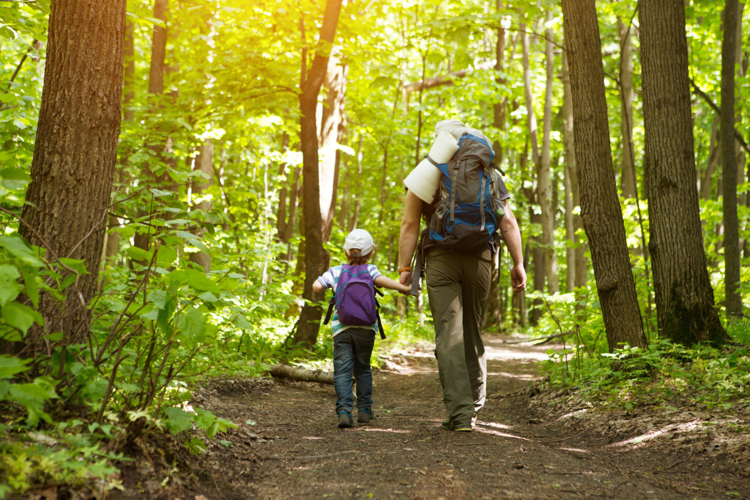 father holding hand of little son with backpack hiking in ID: 36732 father holding hand of little son with backpack hiking in forest.