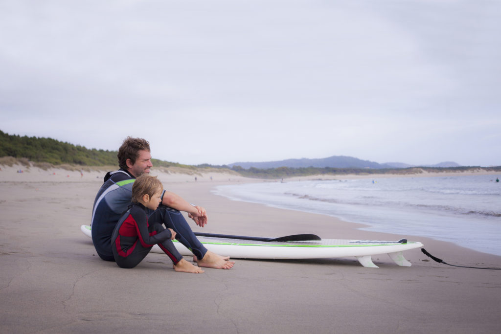 Father with son looking at view and sitting on beach, Viana do Castelo, Portugal