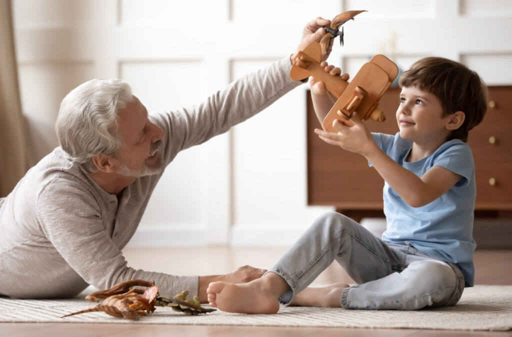 Feliz abuelo senior tendido en el suelo en el salón jugando con un nieto excitado, un abuelo maduro y feliz se relaja participando en un juego divertido con un nieto, disfruta juntos el fin de semana