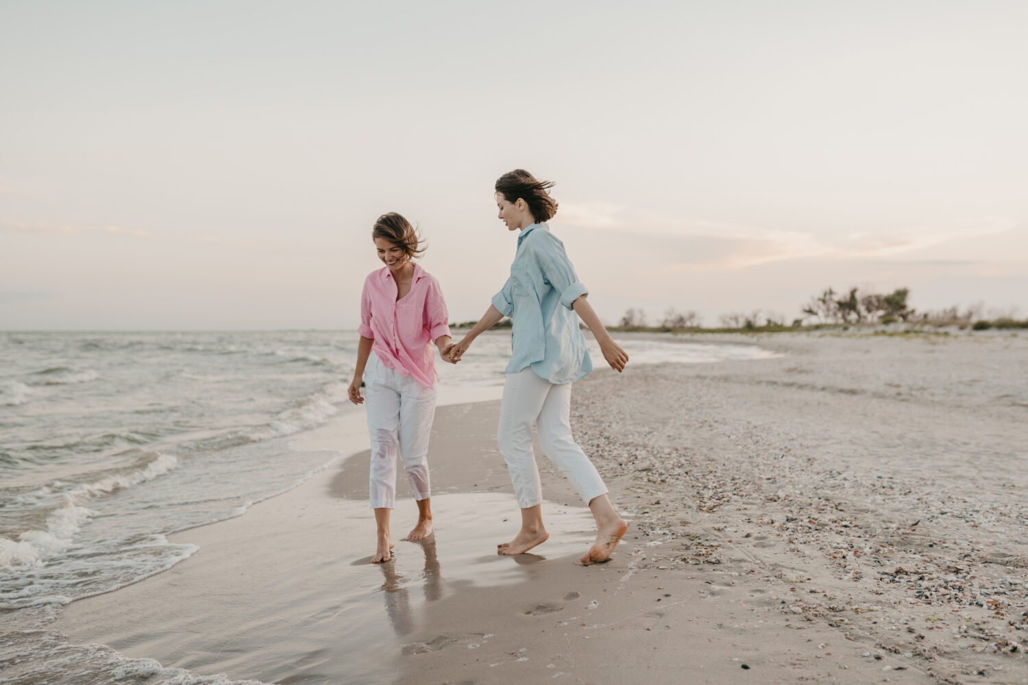 feliz, dos jóvenes amigas divirtiéndose en la playa del atardecer, identidad de género no binaria queer, amor gay lesbiana romance, boho estilo vacaciones de verano usando jeans