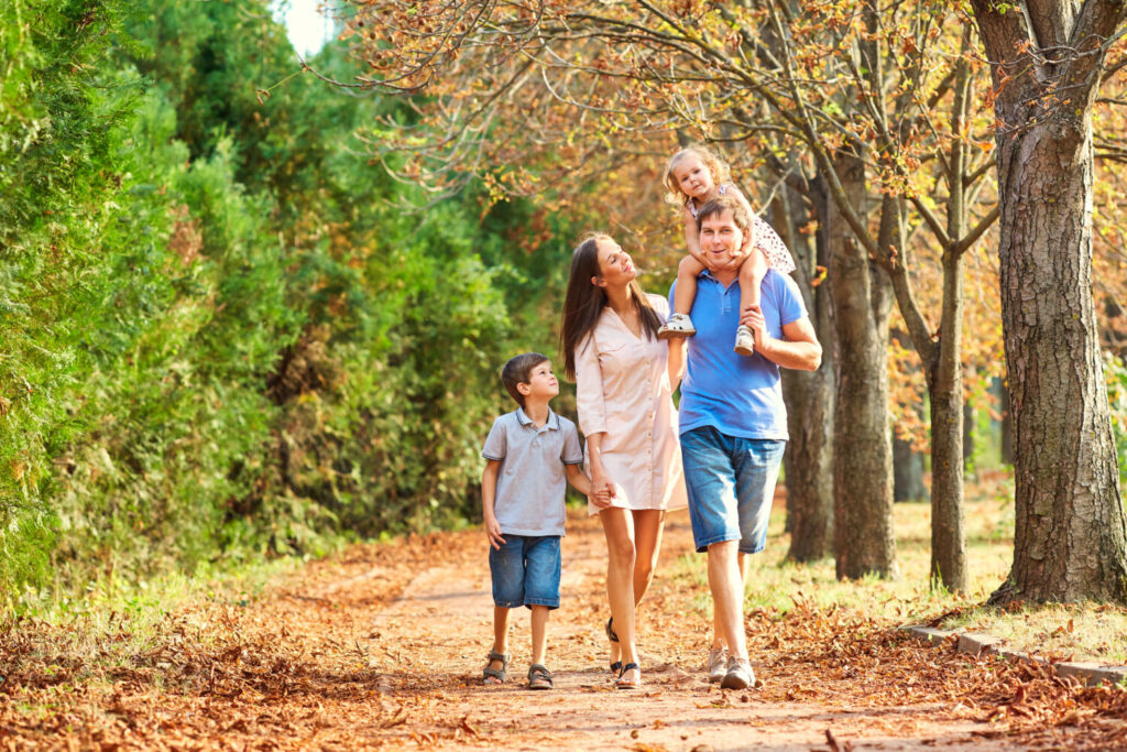 Feliz familia en el parque para un paseo en verano, en otoño. Madre, padre y dos hijos caminando sobre la naturaleza. Padres y niños sonríen, ríen, juegan por la tarde.