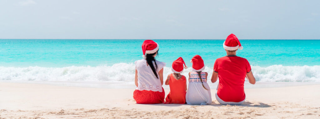 Feliz familia en una playa tropical celebrando las vacaciones de Navidad