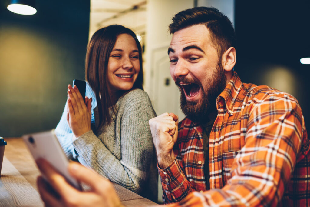 Feliz matrimonio celebrando la victoria en la lotería de internet viendo la transmisión en línea en el smartphone con resultados ganadores.Los hipsters sorprendidos se preguntaron con el triunfo en la subasta en línea apostando en el sitio web por teléfono