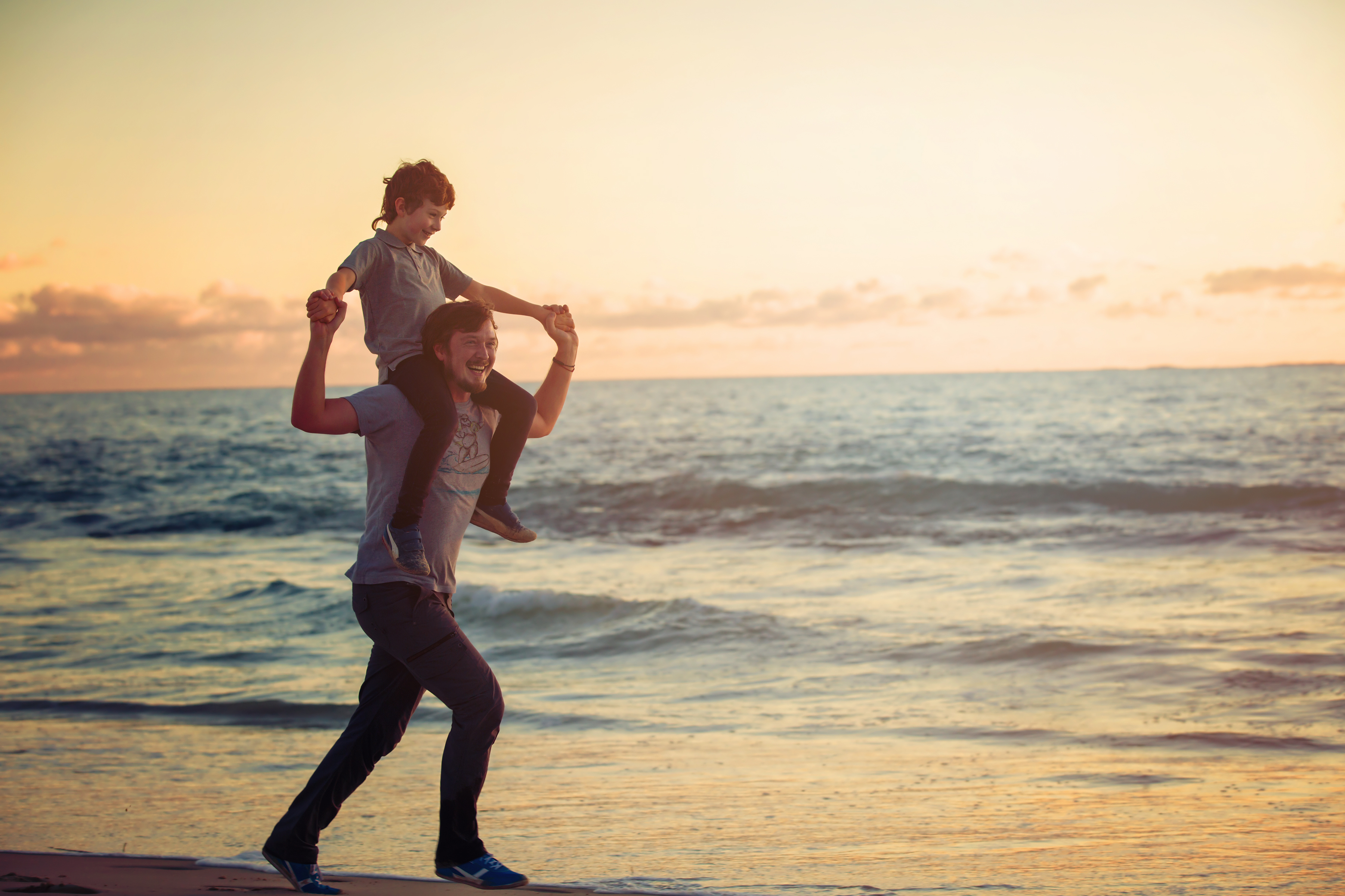Feliz padre e hijo teniendo un buen tiempo familiar en la playa al atardecer en las vacaciones de verano. Estilo de vida, vacaciones, felicidad, concepto de alegría