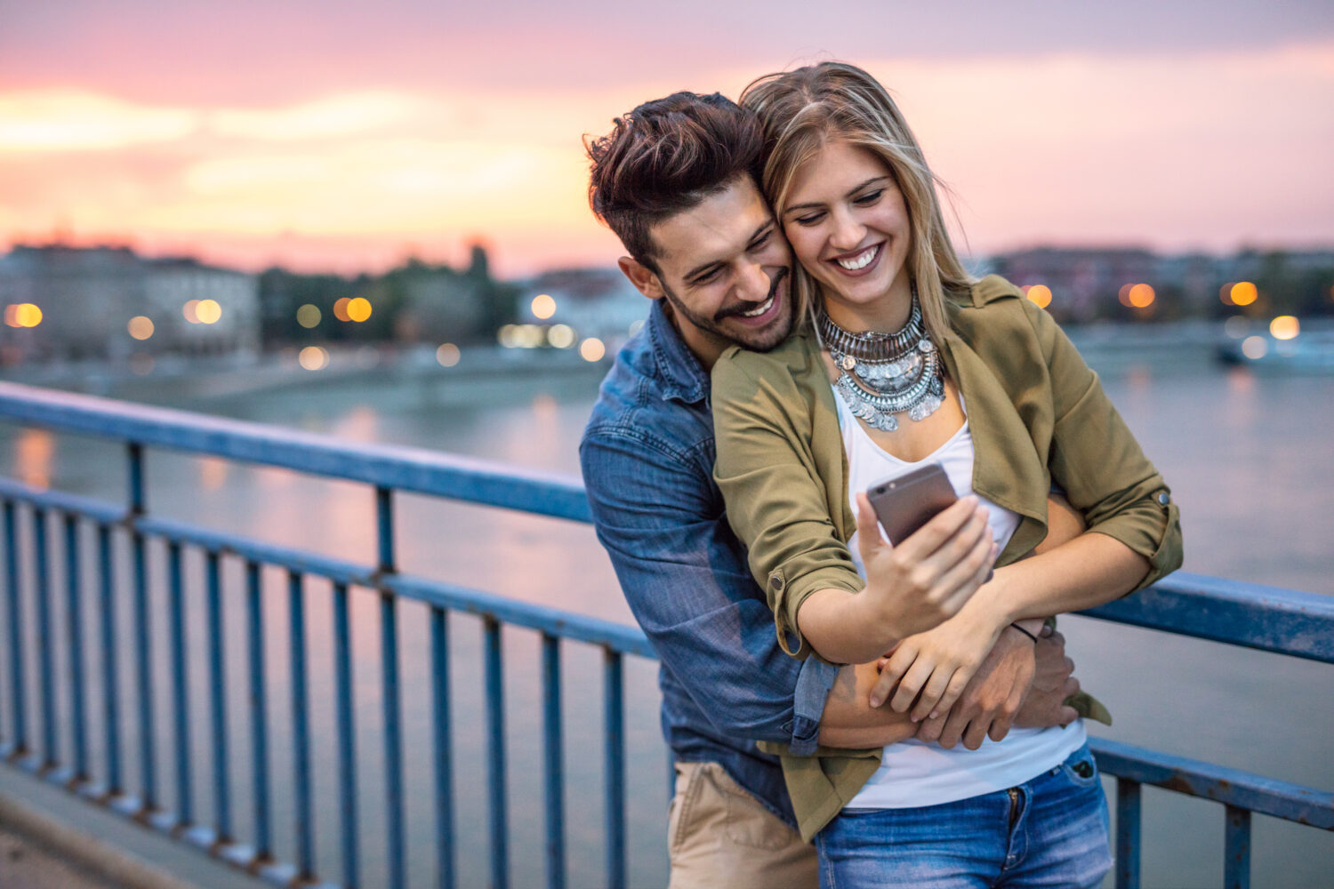 feliz pareja joven buscando ubicacion tanto en el telefono movil