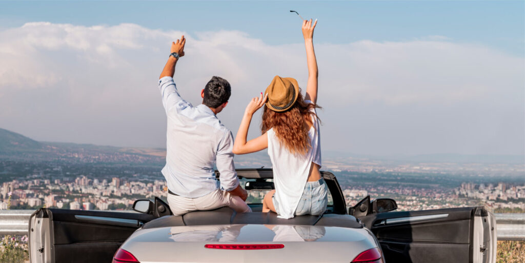 Feliz pareja joven divirtiéndose en camión convertible en un hermoso día de verano. Enfoque selectivo. Desenfoque del movimiento.