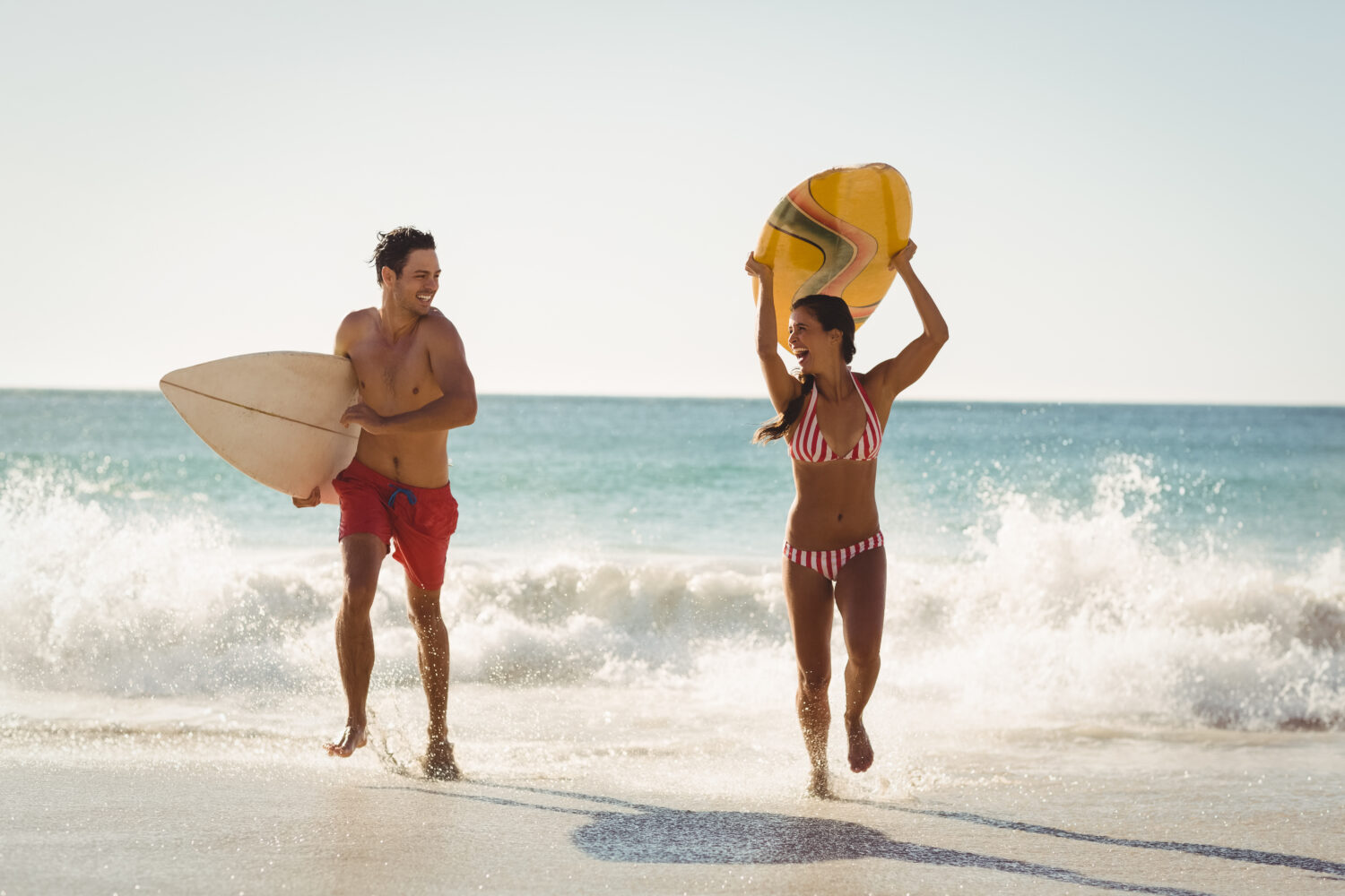 feliz pareja joven sosteniendo una tabla de surf corriendo en