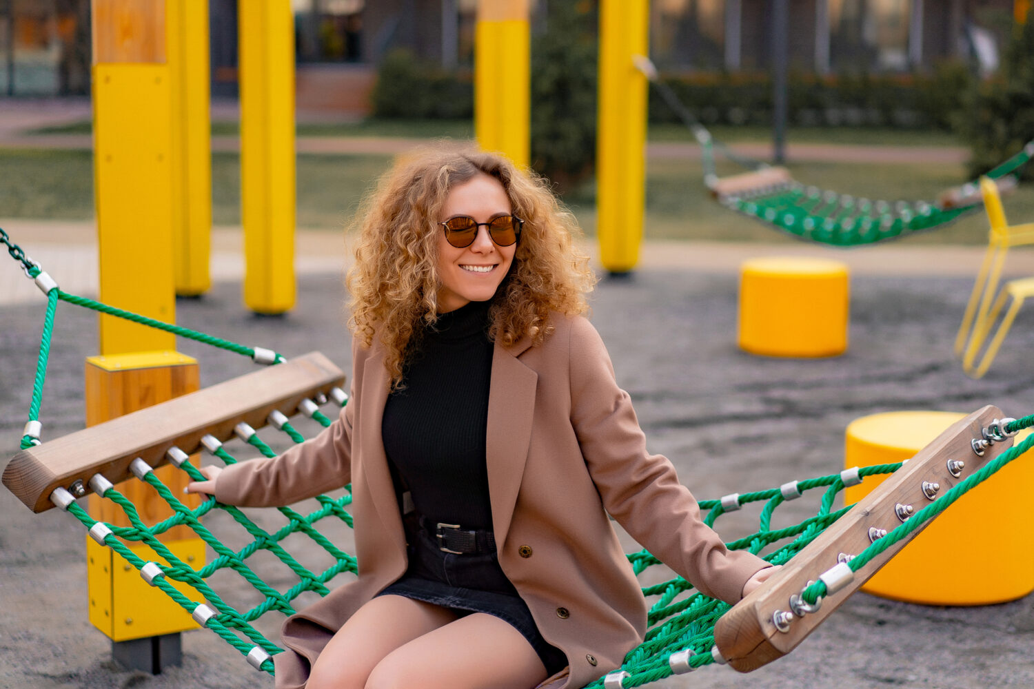 Feliz y atractiva joven mujer de moda riendo mientras juega en un nido de columpios en una playa de arena o un parque urbano