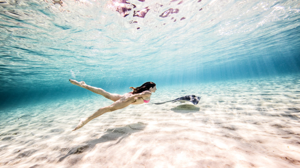 Female free diver swimming with stingray near seabed