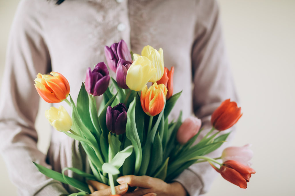Female hands hold a lot of tulips.