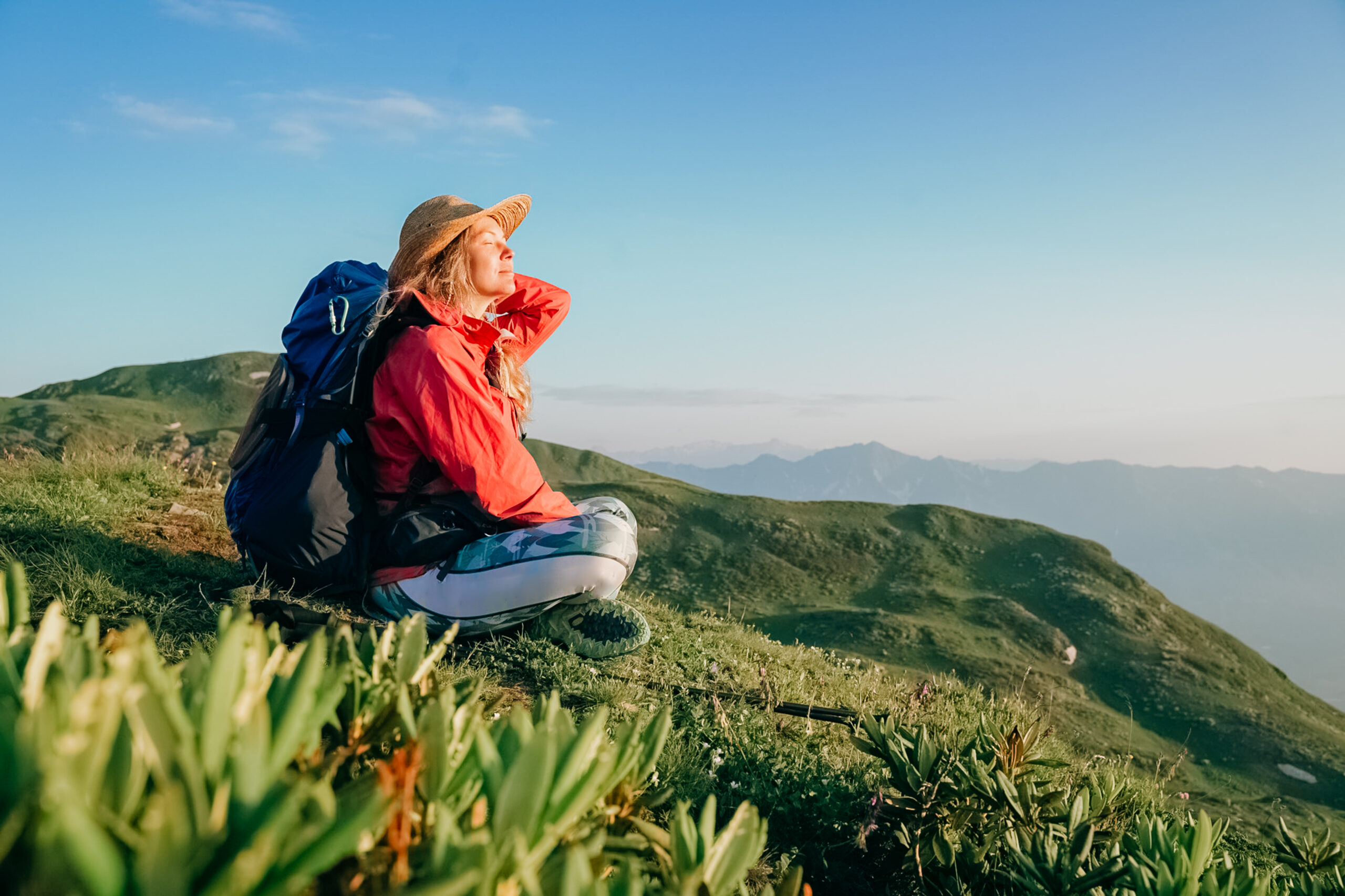 Female hiker enjoys picturesque mountain view
