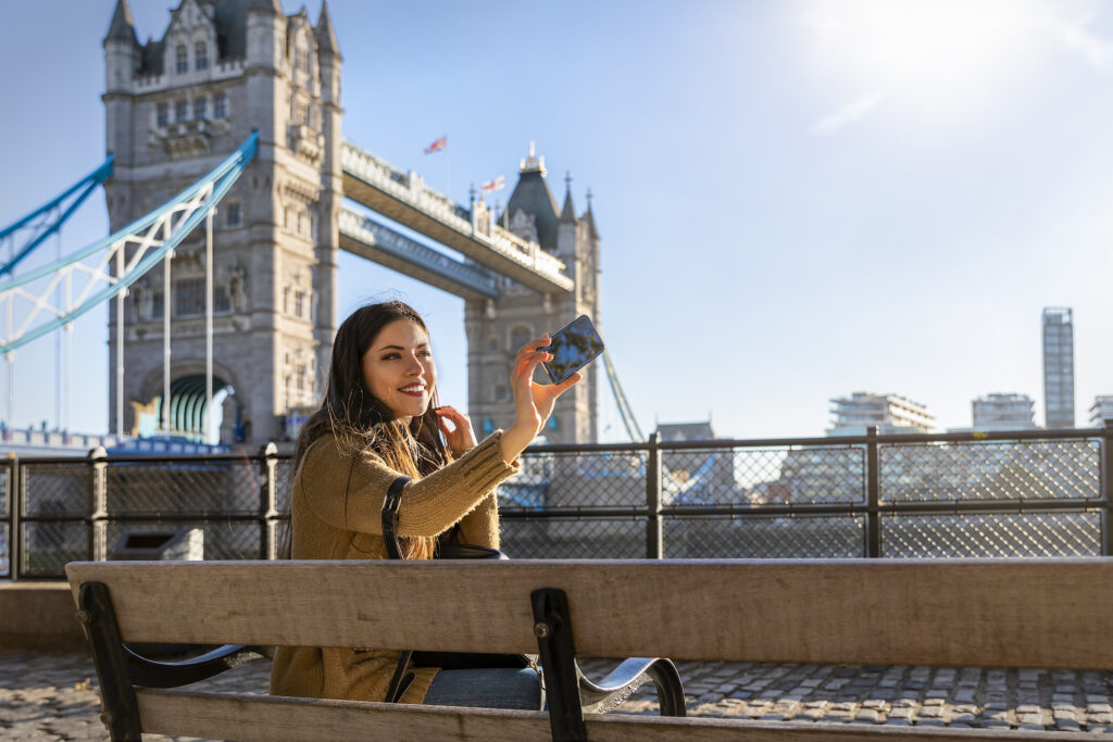 Female London traveler takes a selfie picture with her phone in front of the Tower Bridge