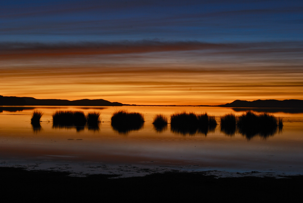 First lights of dawn on Taquile Island are reflected on Lake Titicaca in Puno