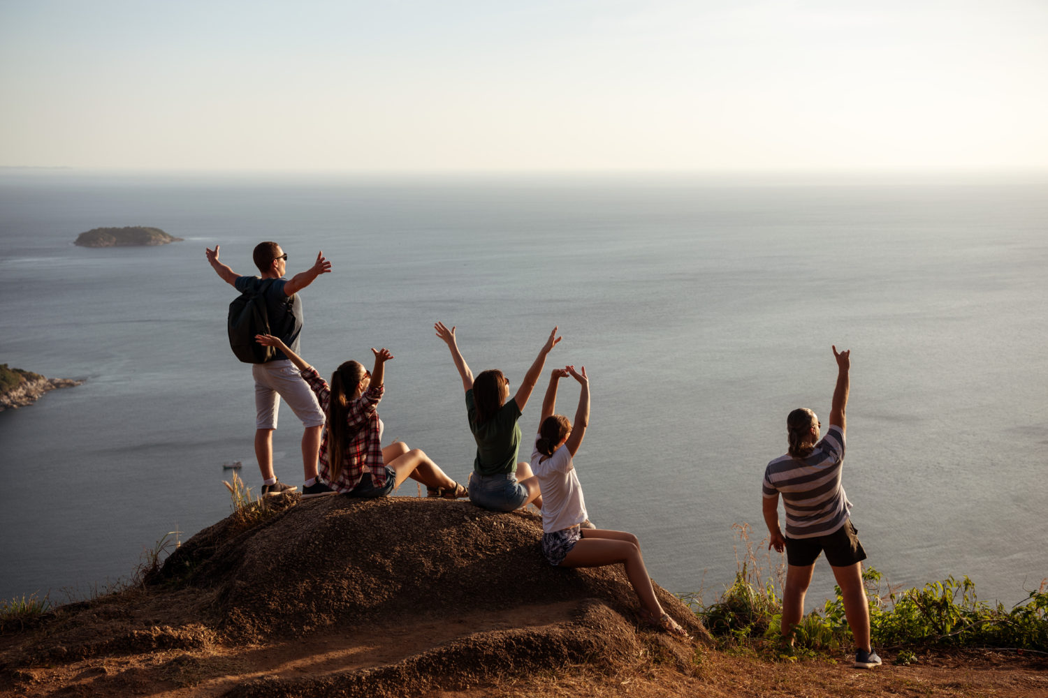 Five happy friends are having fun and enjoying sunset at sea view point