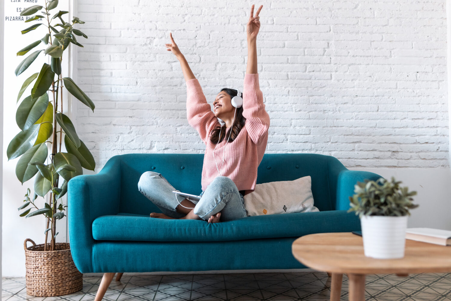 Fotografía de una joven motivada escuchando música con tablet digital mientras estaba sentada en el sofá de su casa.