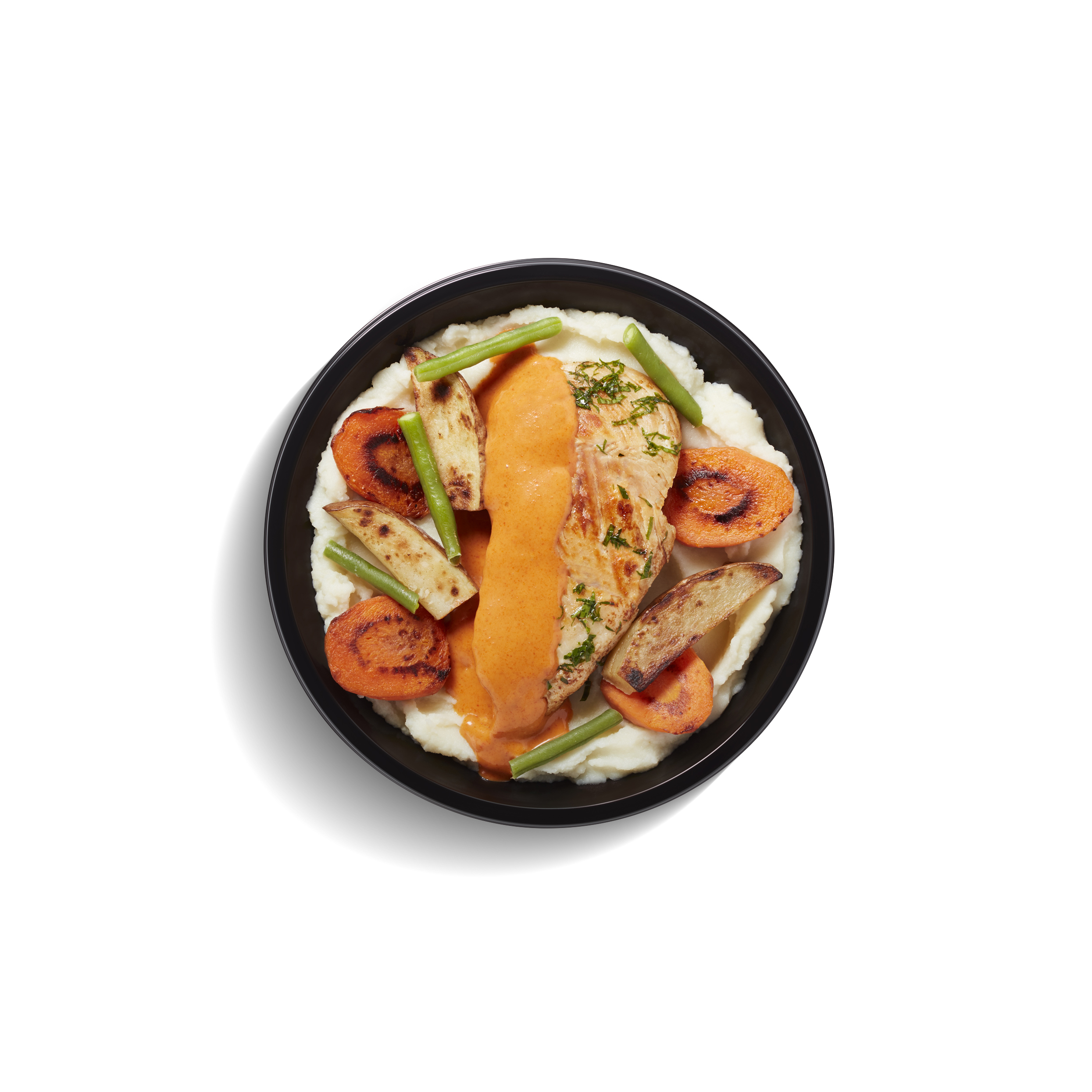 FRED – Pollo asado con salsa suave de curry rojo, pure de papas y vegetales asados