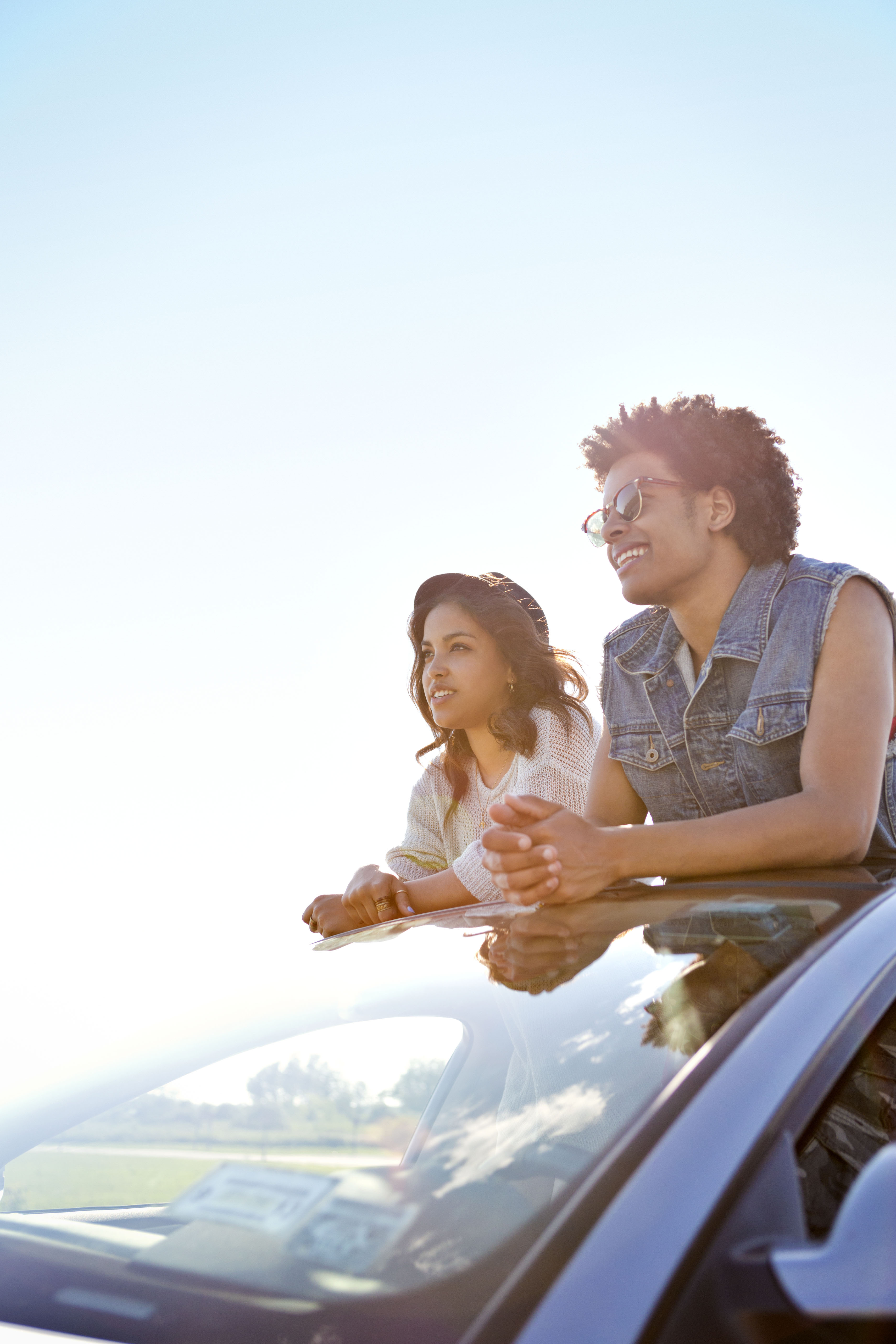 Friends leaning out of a car’s sunroof