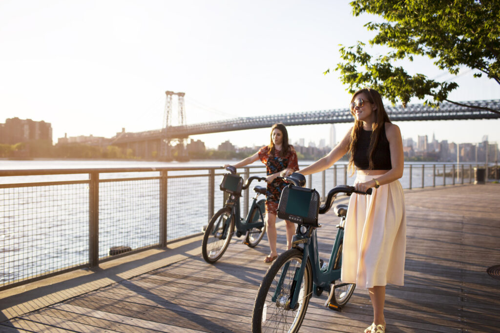 Friends with bicycle walking on promenade against Williamsburg Bridge during sunset ID: 74778 USA, New york state, New York, Brooklyn
