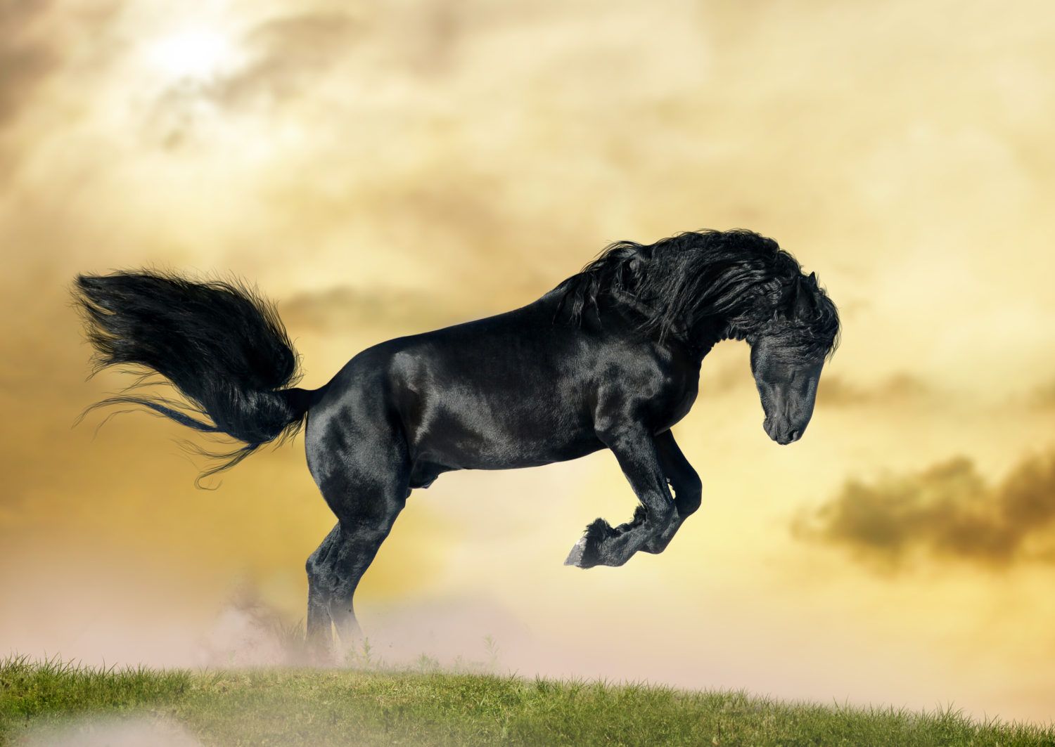 friesian stallion in sunset
