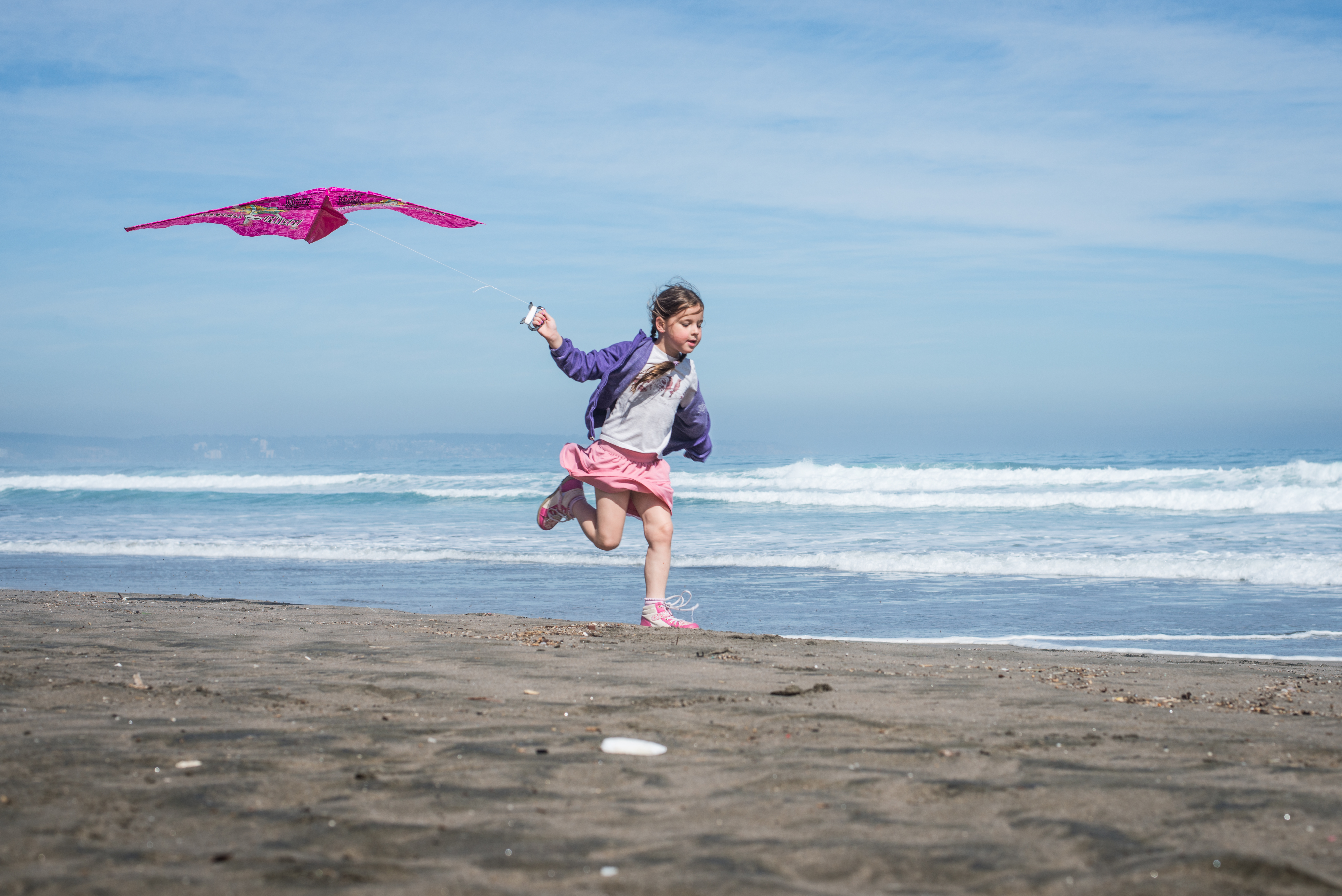 Full Length Of Girl With Kite Running At Beach Against Sky